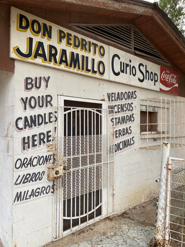 You can find bilingual ads on the gift shop’s wall interweaving Spanish and English. The particular style and color of the letters is common in Mexican family run stores. The gift shop, which I believe is now closed to the public advertises religious candles, incense, medicinal herbs, books, prayers and miracles.