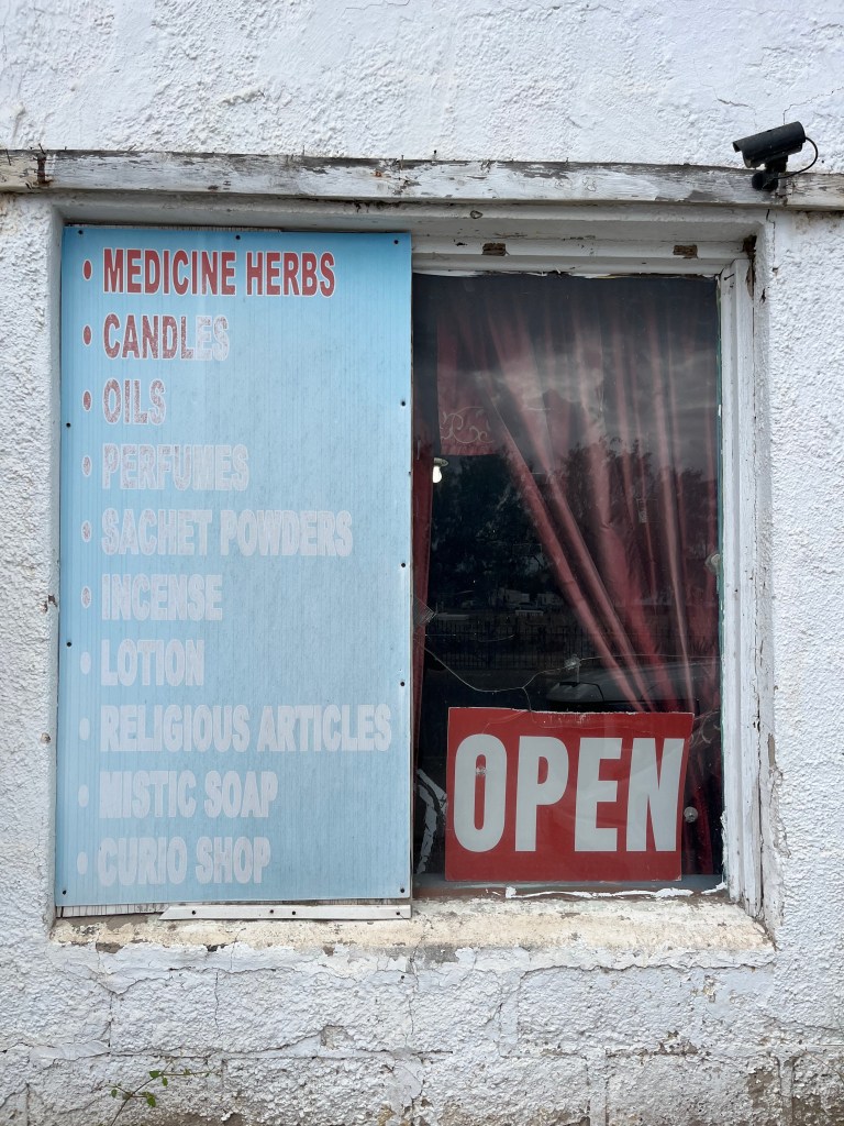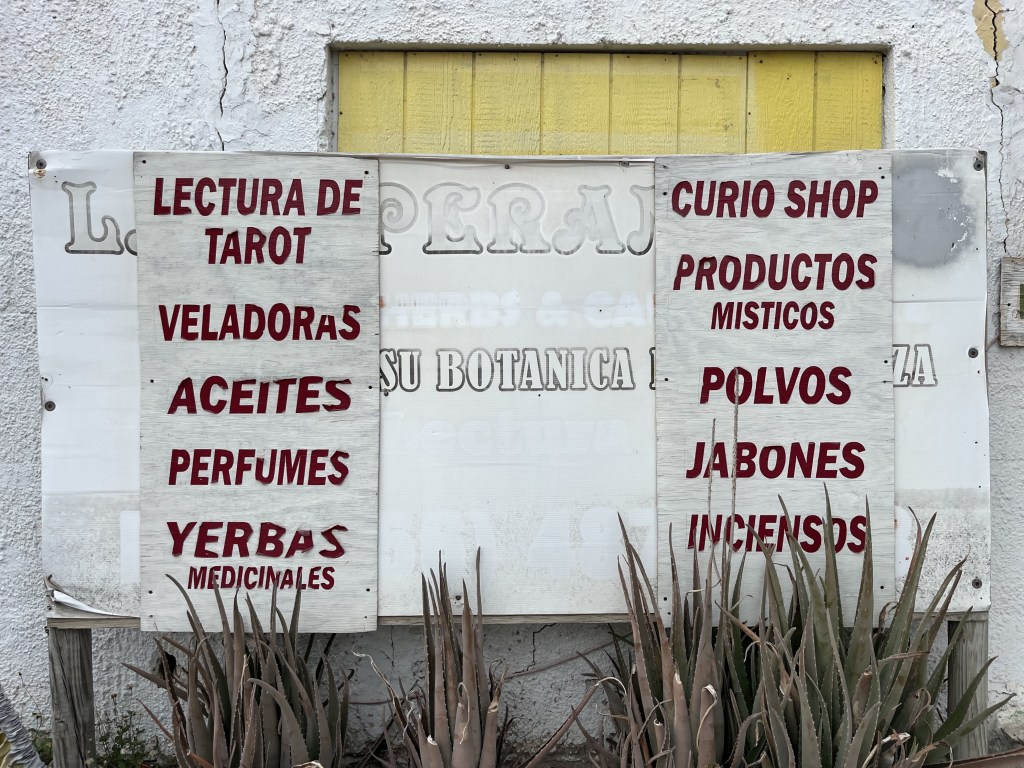 On September 30, 2025 I visited Matamoros, Mexico and found a few hierberias in the old city center. I met a curandero named Luis at Hierberia San Benito Abad. There were two neon green paper signs affixed to the bars on the windows advertising: se hacen limpias meaning spiritual cleanses are done here. Luis explained to me his approach to limpias, which involve the movement of energy. He said that after receiving a limpia the person feels a sense of peace or relaxation after removing negative energy. He had two 5-gallon buckets on the floor filled with plants and some water to keep them fresh. Fresh plants are usually stored in that fashion for limpias.