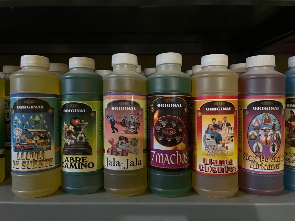 Hierberia San Benito Abad also has a wide range of aguas espirituales for different purposes. The ones featured in the slideshow are water based and include natural essences extracted from plants, aromas and herbs. The names of them are: Lluvia de Suerte, Abre Camino, Jala-Jala, 7 Machos, Llama clientes, and Siete Poderes Africanos.