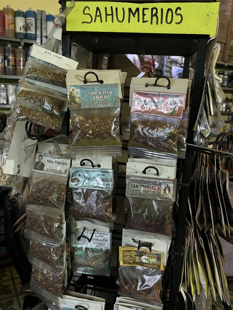 There is rectangular display featuring sahumerios or aromatic blends of incense. The blends can include dried leaves, aromatic plants, herbs, barks, and resins. They are classified according to purpose. Some are meant to invoke saints, folk heroes or effect certain outcomes depending on the intention.